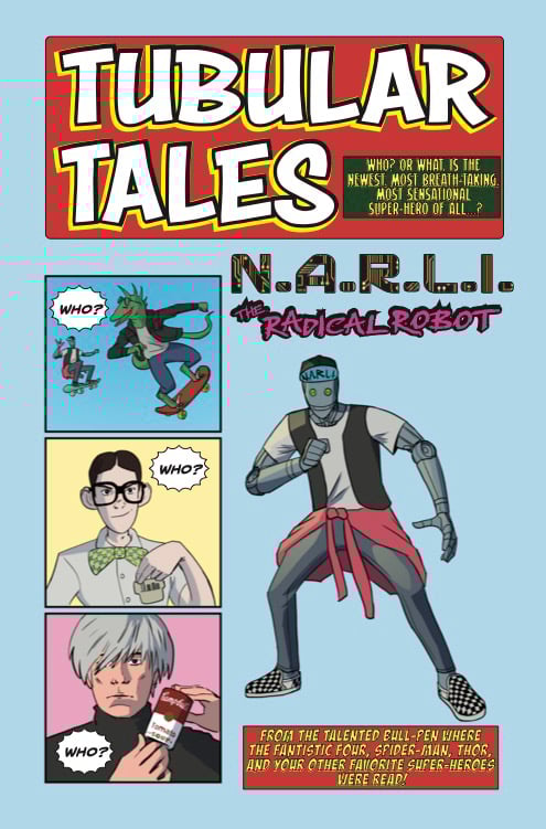 “N.A.R.L.I.'sTubular Tales” is a 22-page collection of short comic stories brought to life by creator and writer Kevin Michael Rowe, with art by the great William Montalvo that introduces N.A.R.L.I. the RADICAL ROBOT!